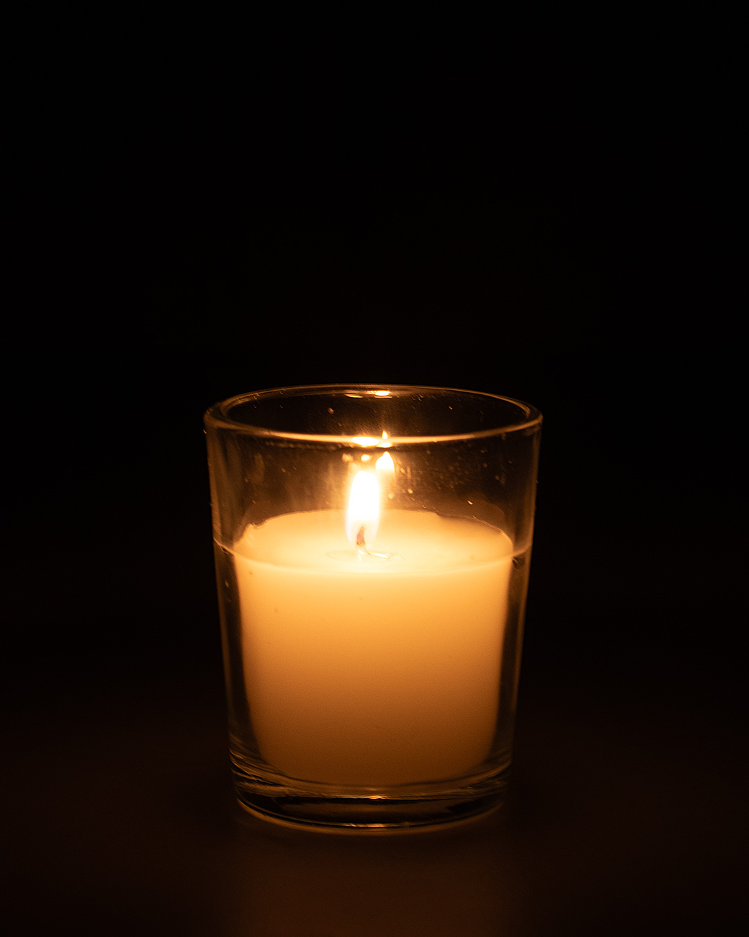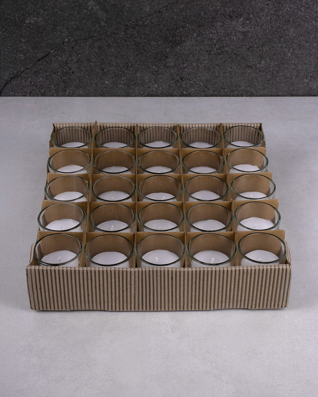 553-178 VOTIVE CANDLE 10 HOURS W/ROUND VASE, WHITE, Ø2", TRAY(25)