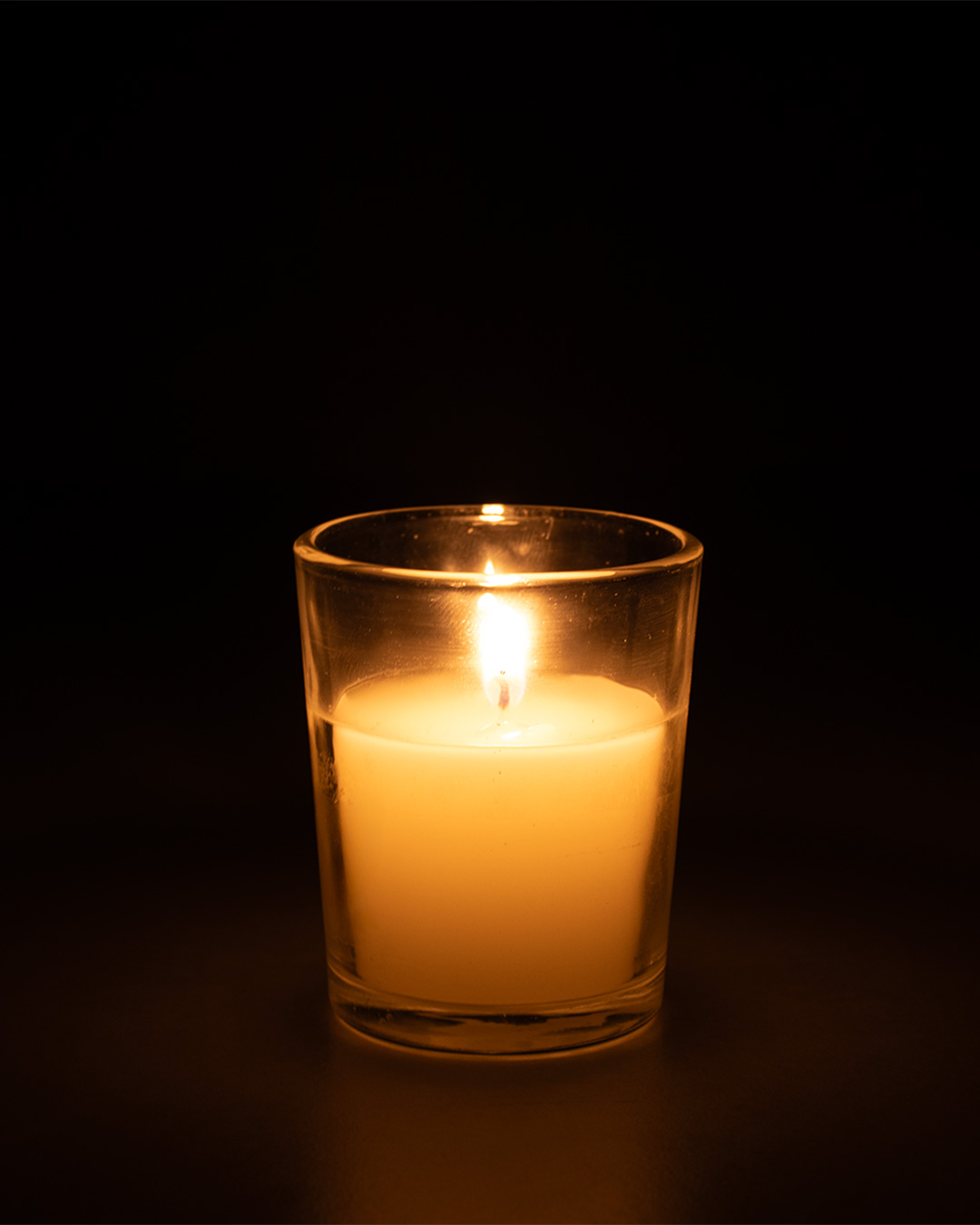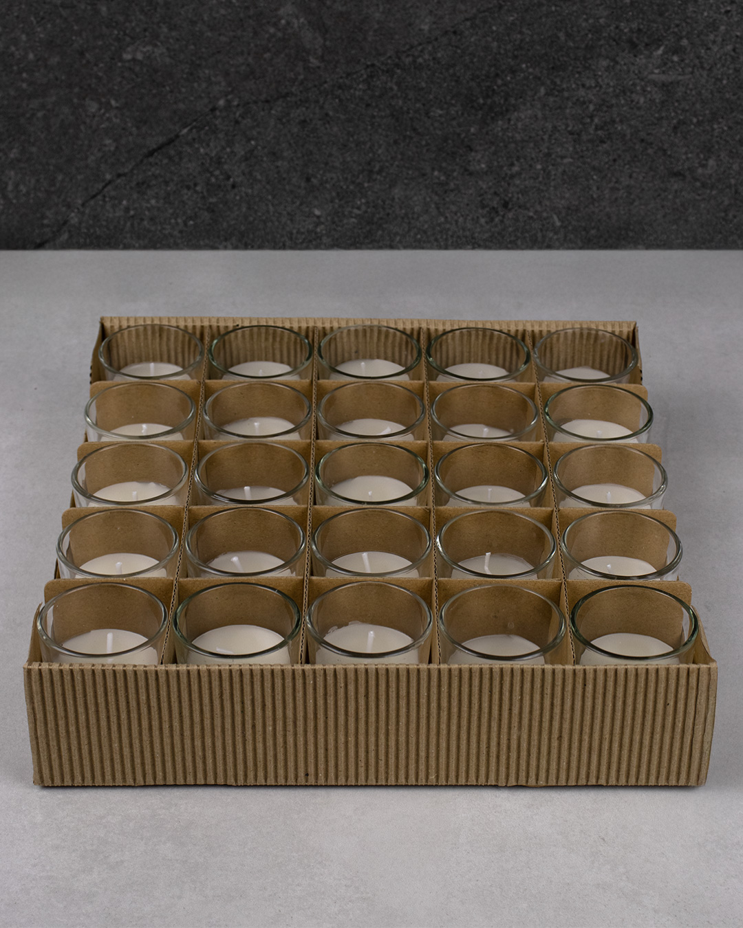 553-191 VOTIVE CANDLE 10 HOURS W/ROUND VASE, IVORY, Ø2", TRAY(25)