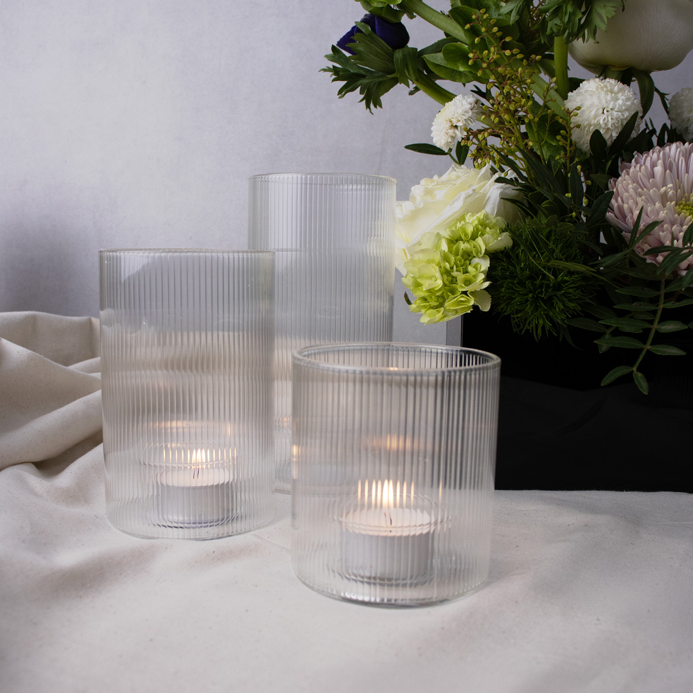 752-013 FLUTED GLASS CANDLE HOLDER CLEAR, Ø3“ x6½”, BOX(8)