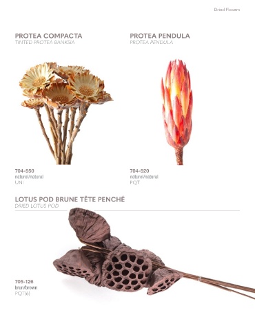 Dried Flowers PROTEA COMPACTA PROTEA PENDULA TINTED PROTEA BANKSIA PROTEA PENDULA 704-550 704-520 naturel/natural naturel/natural UNI PQT LOTUS POD BRUNE TÊTE PENCHÉ DRIED LOTUS POD 705-126 brun/brown PQT(6) 65