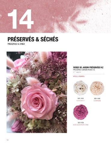14 préservés et séchés PRÉSERVÉS & SÉCHÉS PRESERVED & DRIED ROSES DE JARDIN PRÉSERVÉES KZ PRESERVED GARDEN ROSES KZ 2 ” approx 1/4 BTE(3), CS(60X3) 651-100 651-106 BLANC/WHITE CHAMPAGNE 651-105 ROSE VIOLET/PURPLE PINK 14