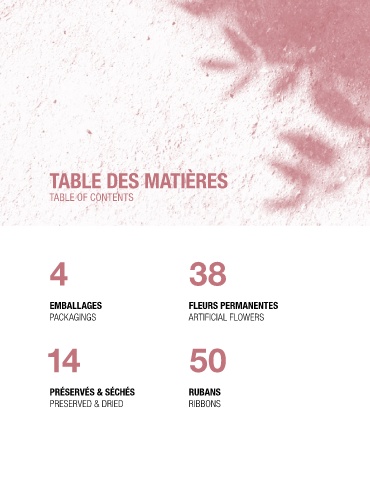 TABLE DES MATIÈRES TABLE OF CONTENTS 4 38 EMBALLAGES FLEURS PERMANENTES PACKAGINGS ARTIFICIAL FLOWERS 14 50 PRÉSERVÉS & SÉCHÉS RUBANS PRESERVED & DRIED RIBBONS
