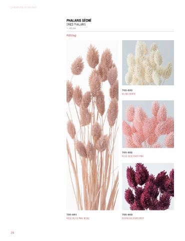 préservés et séchés PHALARIS SÉCHÉ DRIED PHALARIS ≈ 40 cm PQT(15g) 700-690 BLANC/WHITE 700-692 ROSE BÉBÉ/BABY PINK 700-691 700-693 ROSE-BEIGE/PINK BEIGE BOURGONE/BURGUNDY 24