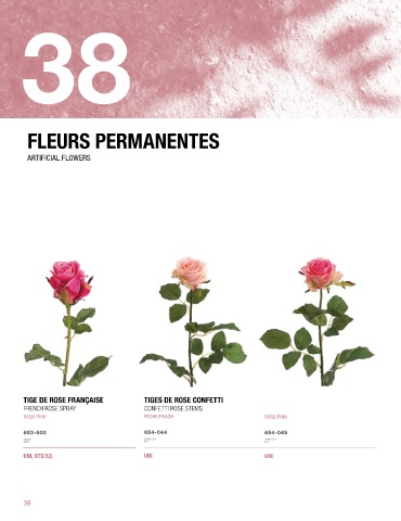 38 fleurs permanentes FLEURS PERMANENTES ARTIFICIAL FLOWERS TIGE DE ROSE FRANÇAISE TIGES DE ROSE CONFETTI FRENCH ROSE SPRAY CONFETTI ROSE STEMS ROSE/PINK PÊCHE/PEACH ROSE/PINK 653-800 654-044 654-045 1/2 1/2 28” 27 ” 27 ” UNI, BTE(12) UNI UNI 38