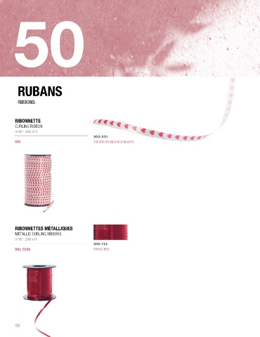 50 rubans RUBANS RIBBONS RIBONNETTE CURLING RIBBON 3/16”- 500 V/Y 303-031 UNI COEURS ROUGES/RED HEARTS RIBONNETTES MÉTALLIQUES METALLIC CURLING RIBBONS 3/16”- 250 V/Y 300-113 UNI, CS(6) ROUGE/RED 50