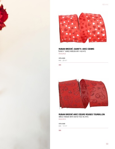 ribbons RUBAN BROCHÉ «DAINTY» AVEC CŒURS “DAINTY” WIRED RIBBON WITH HEARTS ROUGE/RED 378-529 #40 - 20 V/Y UNI RUBAN BROCHÉ AVEC CŒURS ROUGES TOURBILLON WIRED RIBBON WITH SWIRLY RED HEARTS ROUGE/RED 378-535 #40 - 10 V/Y UNI 53