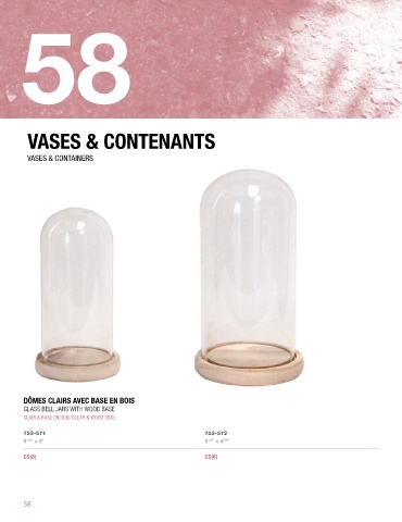 58 vases & contenants VASES & CONTENANTS VASES & CONTAINERS DÔMES CLAIRS AVEC BASE EN BOIS GLASS BELL JARS WITH WOOD BASE CLAIR & BASE EN BOIS/CLEAR & WOOD BASE 753-571 753-572 8 ” x 4” 9 ” x 4 ” 1/2 3/4 1/4 CS(8) CS(6) 58