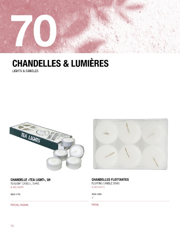 70 chandelles & lumières CHANDELLES & LUMIÈRES LIGHTS & CANDLES CHANDELLE «TEA LIGHT», 5H CHANDELLES FLOTTANTES TEALIGHT CANDLE, 5 HRS FLOATING CANDLE DISKS BLANC/WHITE BLANC/WHITE 553-170 553-180 2” PQT(10), CS(500) PQT(6) 70